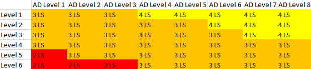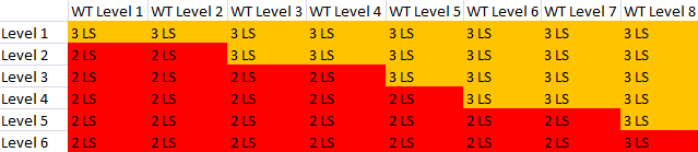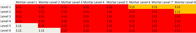 I’ve constructed this chart to show how many lightning spells of what level fully destroy that level mortar-