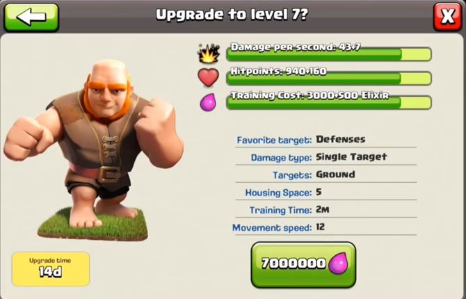 This big fellow will be making his way towards you in the update (most likely on tomorrow). Giants level 7 seem like an urge to bring back the Giant-Healer strategy. These hairy guys will have 50 DPS (damage per second) and 1,100 hit-points; both a steady increase from level 6 giants.
