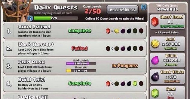 Will Quests be coming in the newest update for Clash of Clans? Daily Quests would be small achievements rewarding you in gems after completing the task.