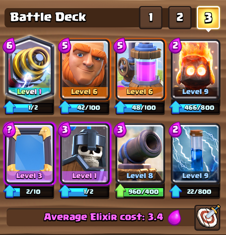Giant: Again, this is one of the most important cards in this sparky deck. The giant should be placed in front of the sparkys so that the giant takes all the damage and leaves the sparkys untouched. Also, if possible, the giant can do some extreme damage to the tower, since your opponent will be focused on taking out the sparkys.
