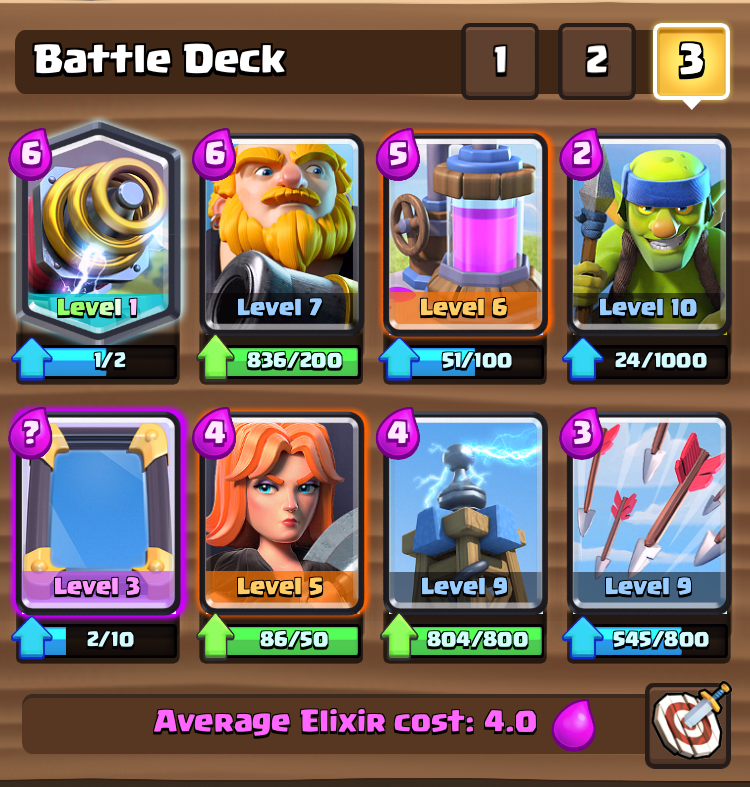 Elixir Collector: The elixir collector should be protected as much as possible, but if the situation arises where you do not have your cannon in rotation, use the elixir collector to stop whatever defensive seeking card is heading toward you.