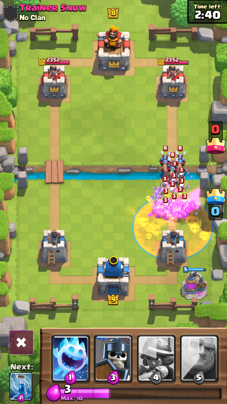 Zap: I would always have a zap at the ready when you are pushing down a lane. The zap can allow you to get an extra hit off on the tower because of its .5 second freeze. Also the zap will be able to take out those pesky goblins and skeletons without wasting valuable seconds for your other troops to destroy them all.