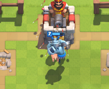 Using this, you can decide what to play the mega minion against. Generally, you want to place the mega minion at the back, in the front of your tower so it can do the most possible damage without having the follow the attacking card around. Here’s how you should defend against the hog rider-