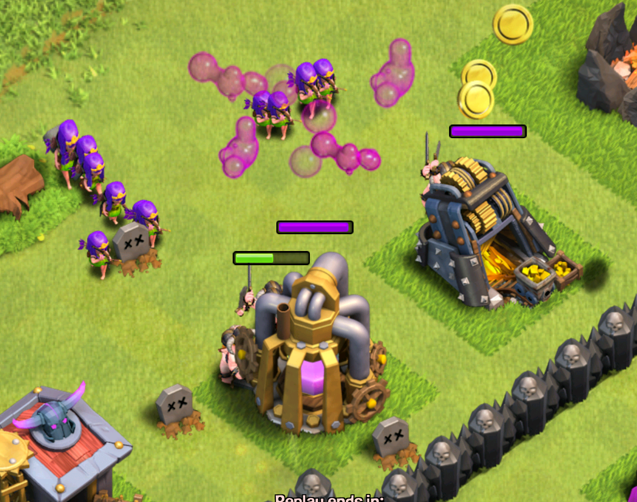 Precise Barch: This strategy should be used when the collectors are farther apart, which buildings in between them. Usually you want to place 4 barbarians and 4 archers, which is enough to take out the resource collector.