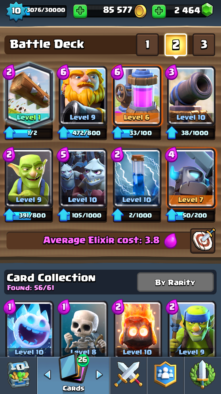 While this log deck might seem a bit strange at first, it is a ton of fun to play! First off, you want your main pushes to be with either the miner or the prince. The guards provide a good defense, and the furnace allows hogs or giants to be pulled. Ideally, you want to set up in the back with the prince, combined it with the miner and ice spirit as it got to the bridge. Some fire spirits should be in with the furnace and the log will push away any opposing troops!