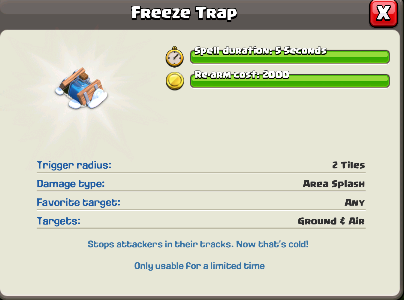 The duration of a freeze trap is quite long, at 5 seconds. 5 seconds freeze is the same as a level 1 freeze spell within the Clash of Clans attacking sphere. Along with the freeze spell, the freeze trap will be able to freeze both ground and air units.