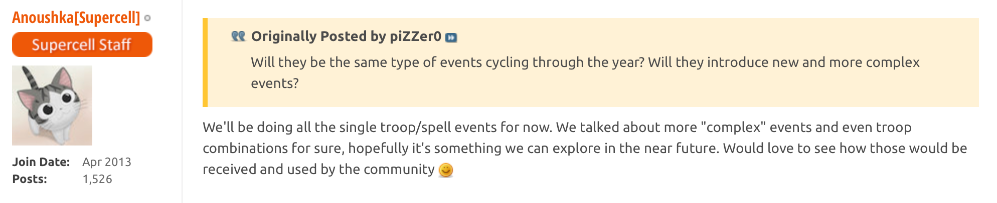 First up, on the Supercell forums, Anousha, one of the moderators announced that the Clash of Clans team is looking to do more with events than just single troop and spell events repeated.