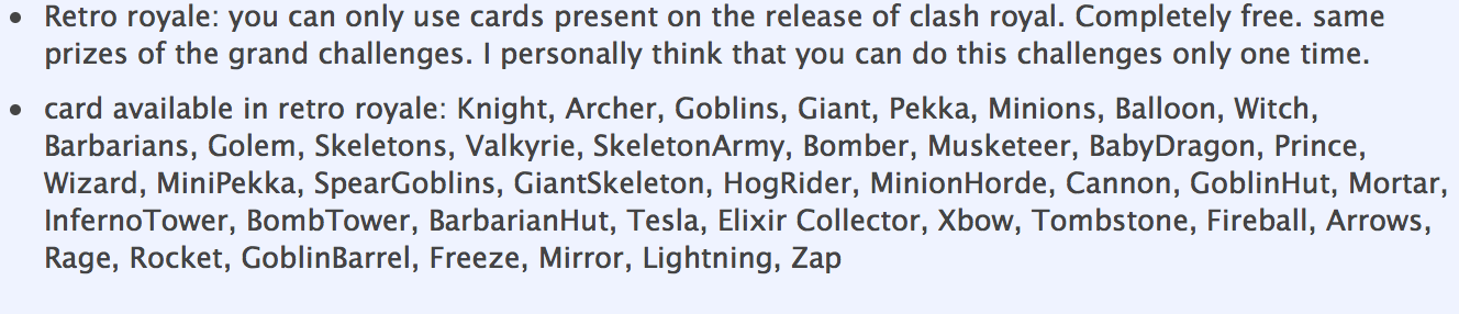 Retro means throwback, so how can we have a retro royale when Clash Royale is only 1 years old? Well, since Clash Royale was released, a total of 28 cards have been added to the game. As the leak states, only the cards ORIGINALLY in Clash Royale would be available for battle during the Retro Royale challenge.