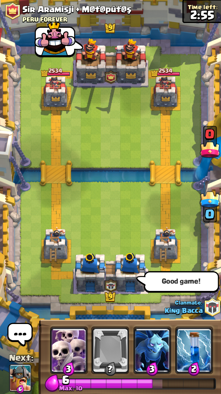 That little symbol right there shows what King Bacca is about to play. Now I know that he wants to play the goblin hut there and I can adjust accordingly to do what I want to. Communication is the best and most important part of winning 2v2. If you can figure out how your clanmate likes to play, its a huge step towards clan battle domination.