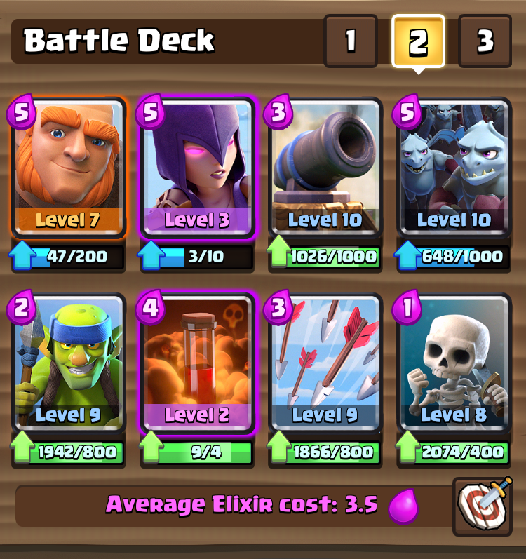 Lastly we have the giant witch Retro Royale deck, which was super popular because of the almost certain counters of barbarians and minion horde. Big pushes are this deck’s specialty!