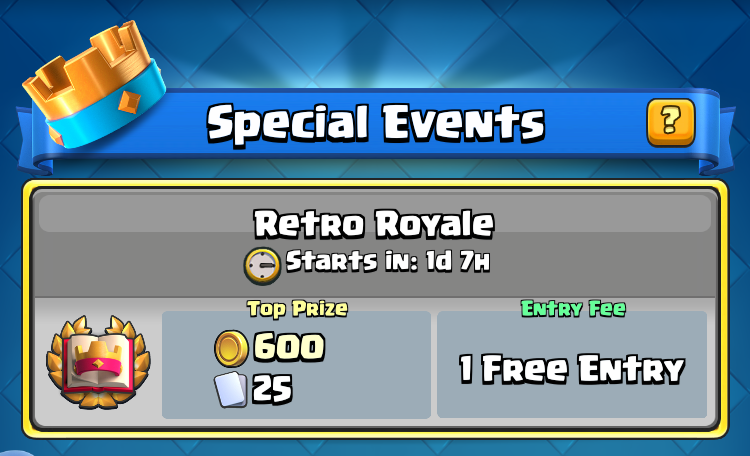 So as you guys have probably figured, Retro Royale is a throwback special event. ONLY the cards that were available when Clash Royale was first released will be available. This means that there will no cards added in any update, which is roughly 2/5 of all cards. The Clash Royale team states that Clash Royale was smaller back then, so the rewards and the challenge will be smaller.